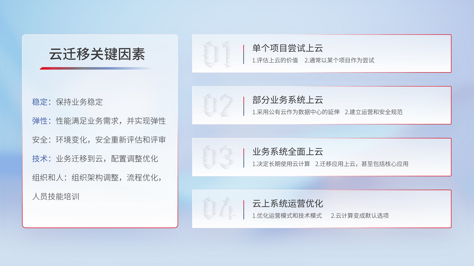 结合实际业务,,,,从规划设计、、、、云平台选型、、、、云原生改造、、数据迁移、、集成交付,,迁移全过程为客户识别最佳上云路径,,,做好风险识别管理,,,设计网络架构、、、、身份权限、、安全审计合规、、、操作审计、、日志审计、、、、监控告警策略、、、、多站点容灾设计等,,,,对云上基础设施进行整体规划,,提升IT治理水平,,,,以满足弹性、、高可用、、高性能的需求。。。