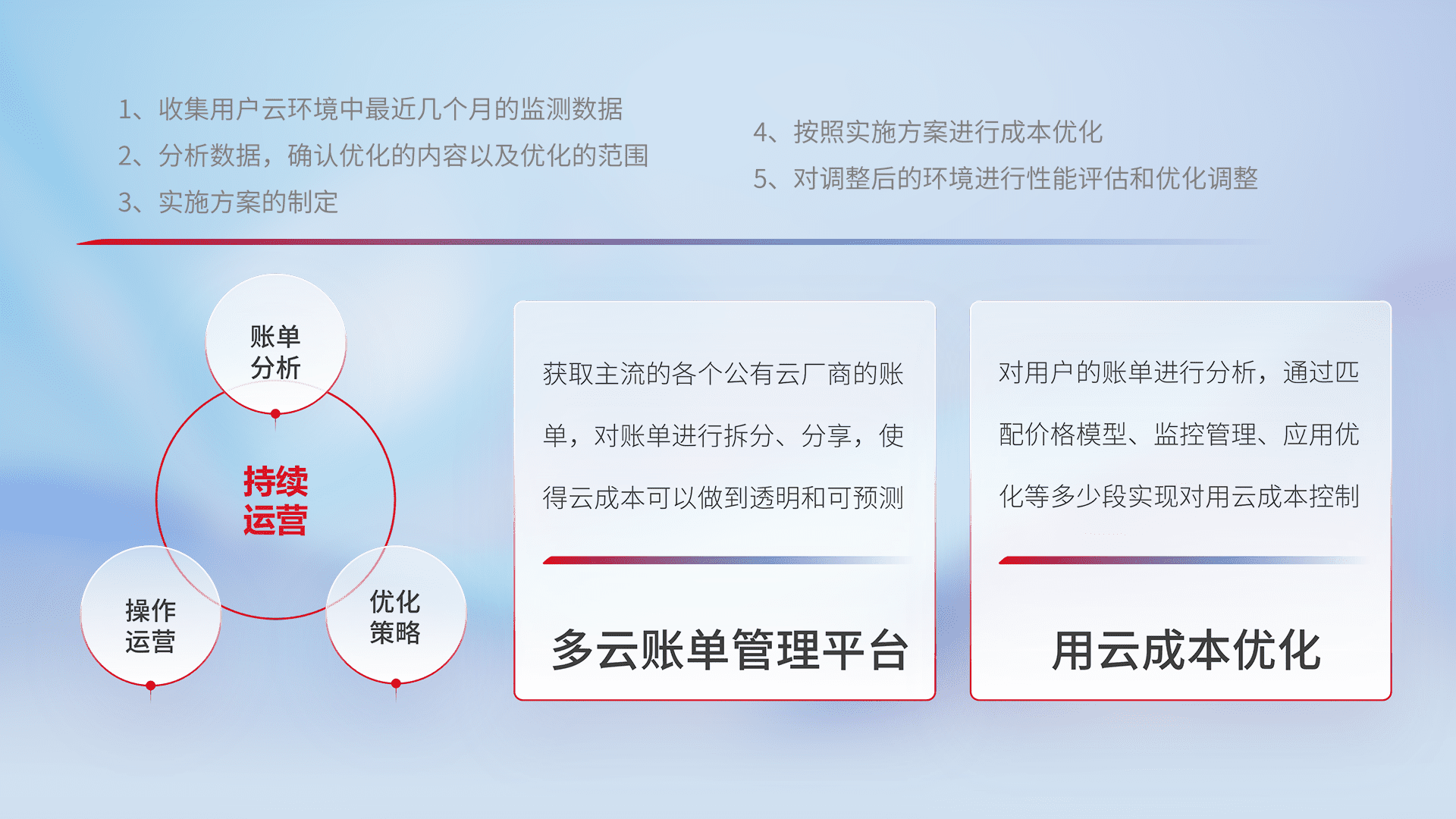 通过多云纳管,,,,以统一的资源数据模型把客户的云资源进行抽象和封装,,,进而实现对多云资源的统一操作,,,,保障云资源管理的可靠性、、稳定性与可用性。。。。量身定制化运维内容,,,配置、、、、开发运维、、、、补丁管理、、、备份、、监控、、认证和访问管理、、、审计和日常巡检等,,保障在用云过程中的可靠度,,稳定度以及高可用率。。